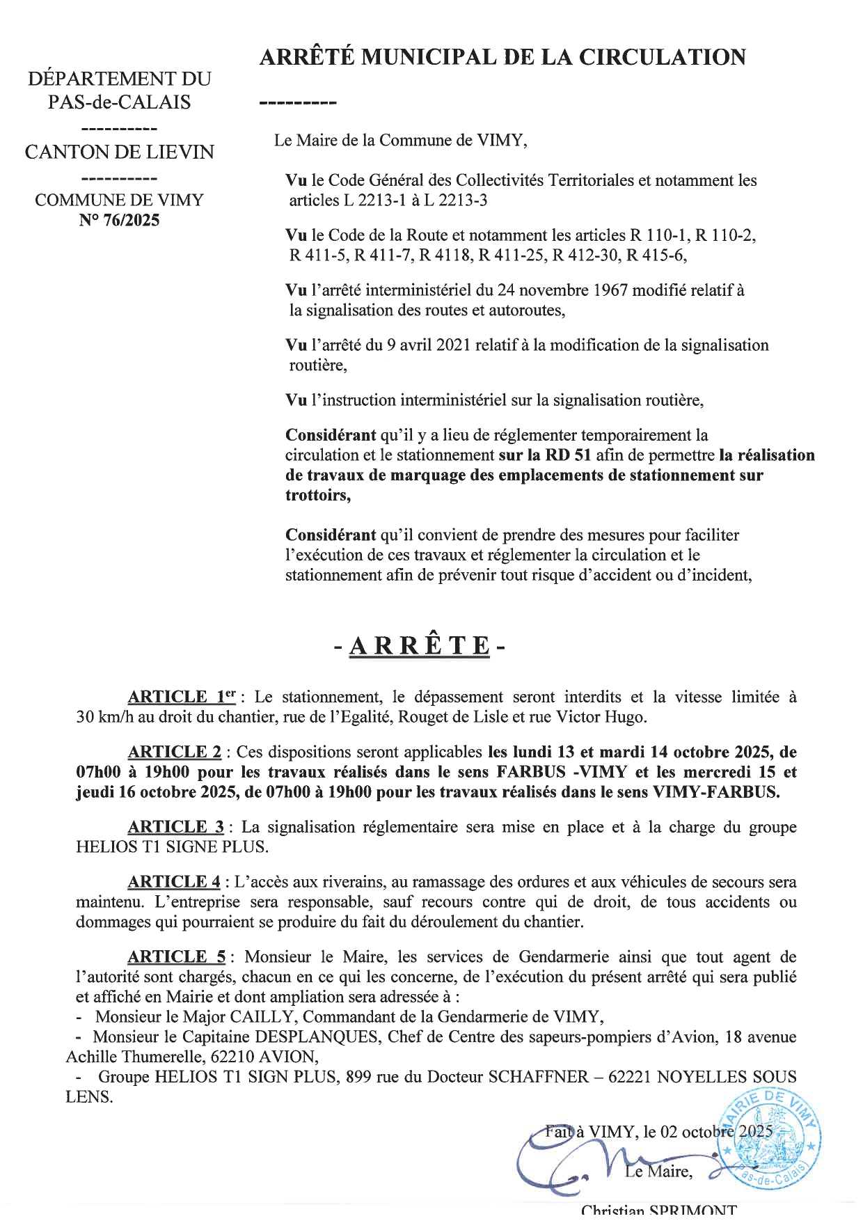 Arrêté municipal : Travaux RD51